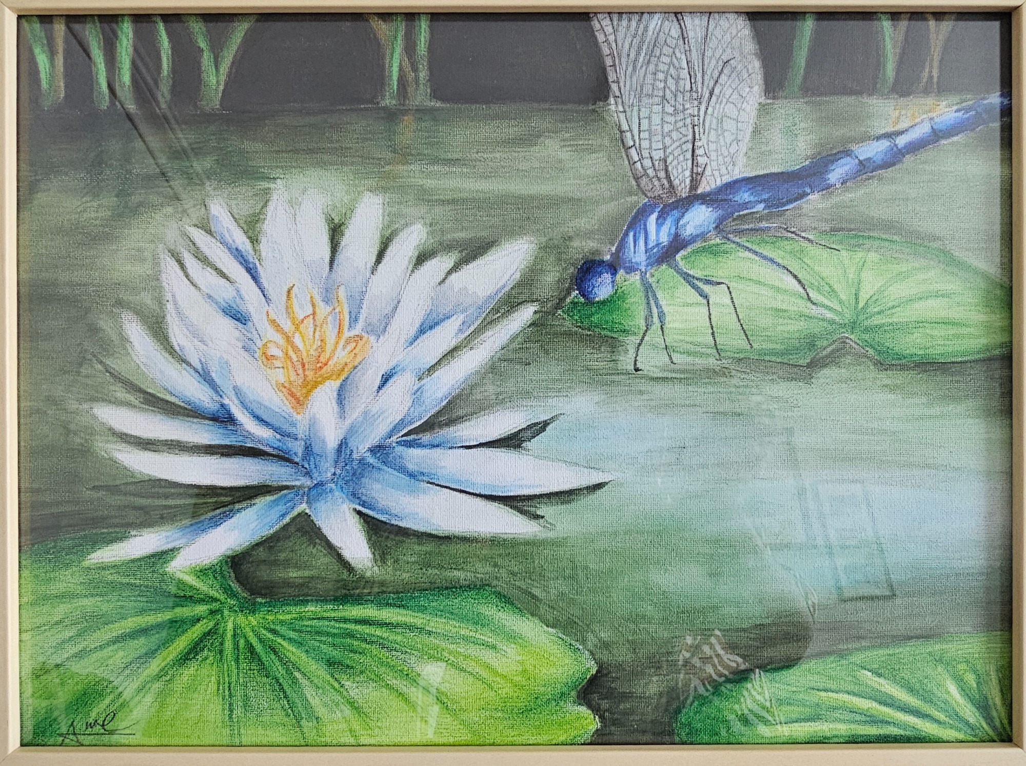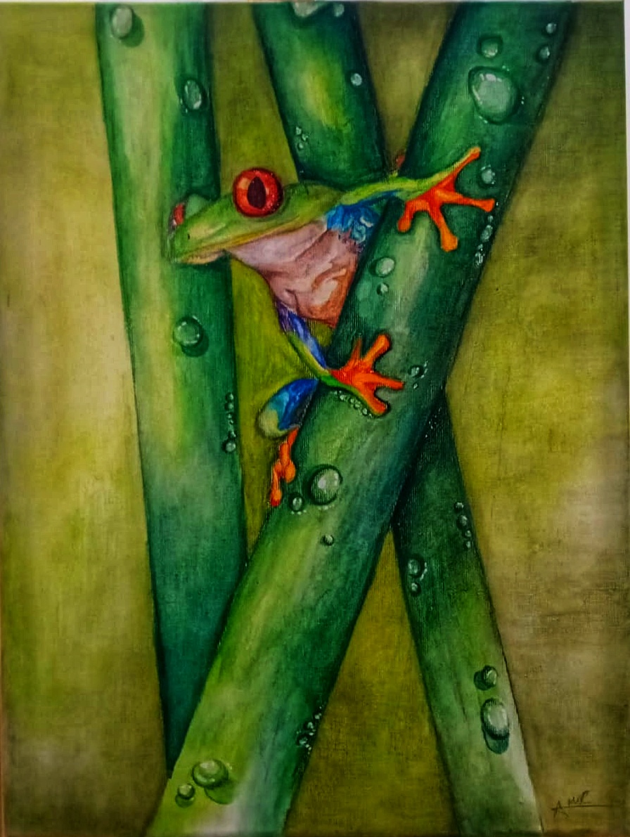 "Tony the Frog" Sold Watercolour of a tree frog on bamboo Framed, stretched canvas Please contact me if you would like a similar painting
