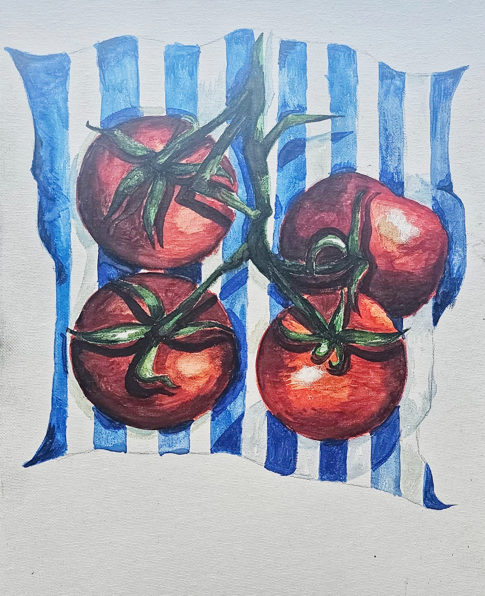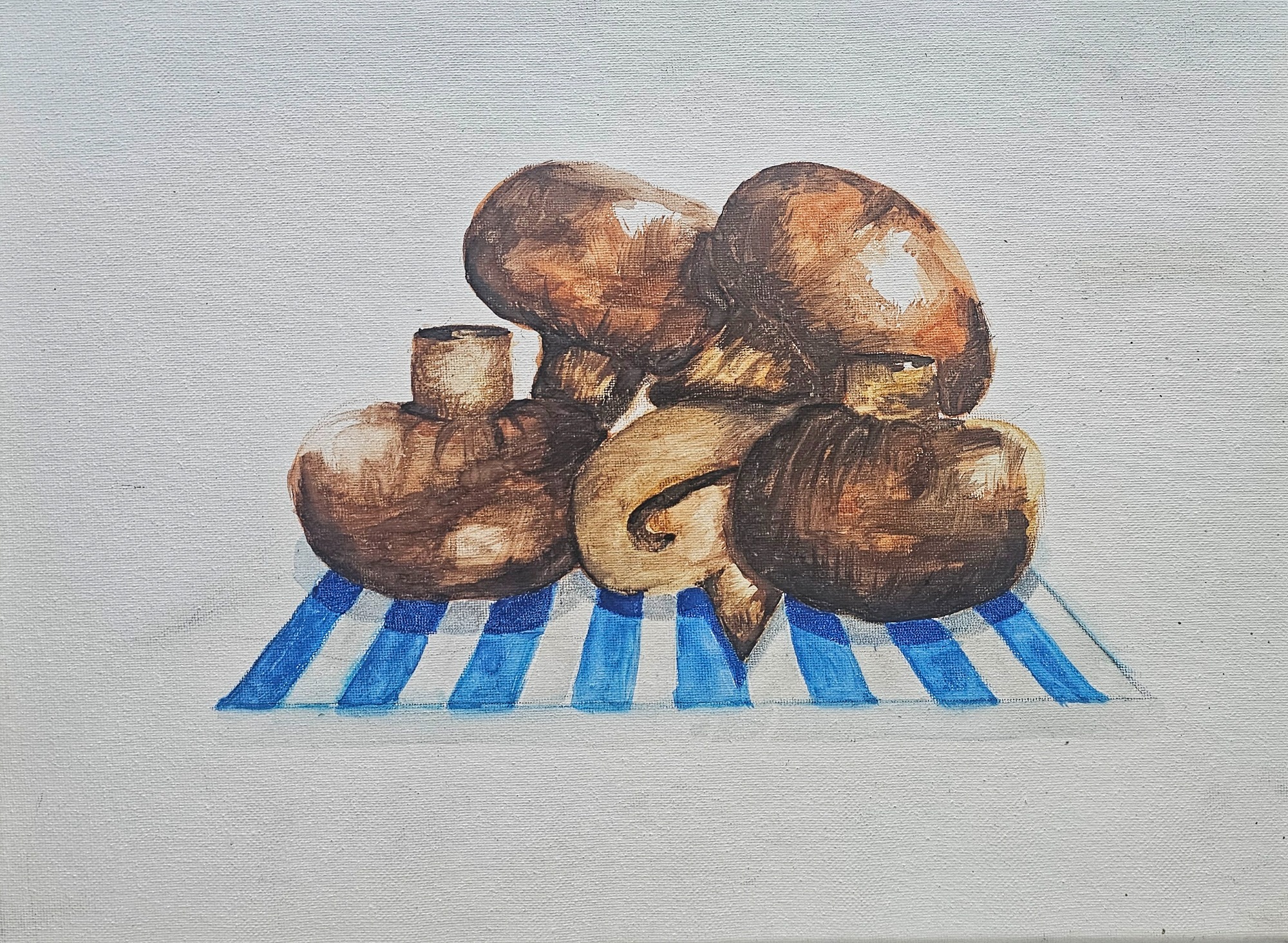 "Mushrooms" £35 unframed £45 framed Chestnut mushrooms on blue and white paper. Watercolour on stretched canvas 16.5 in wide x 12 long