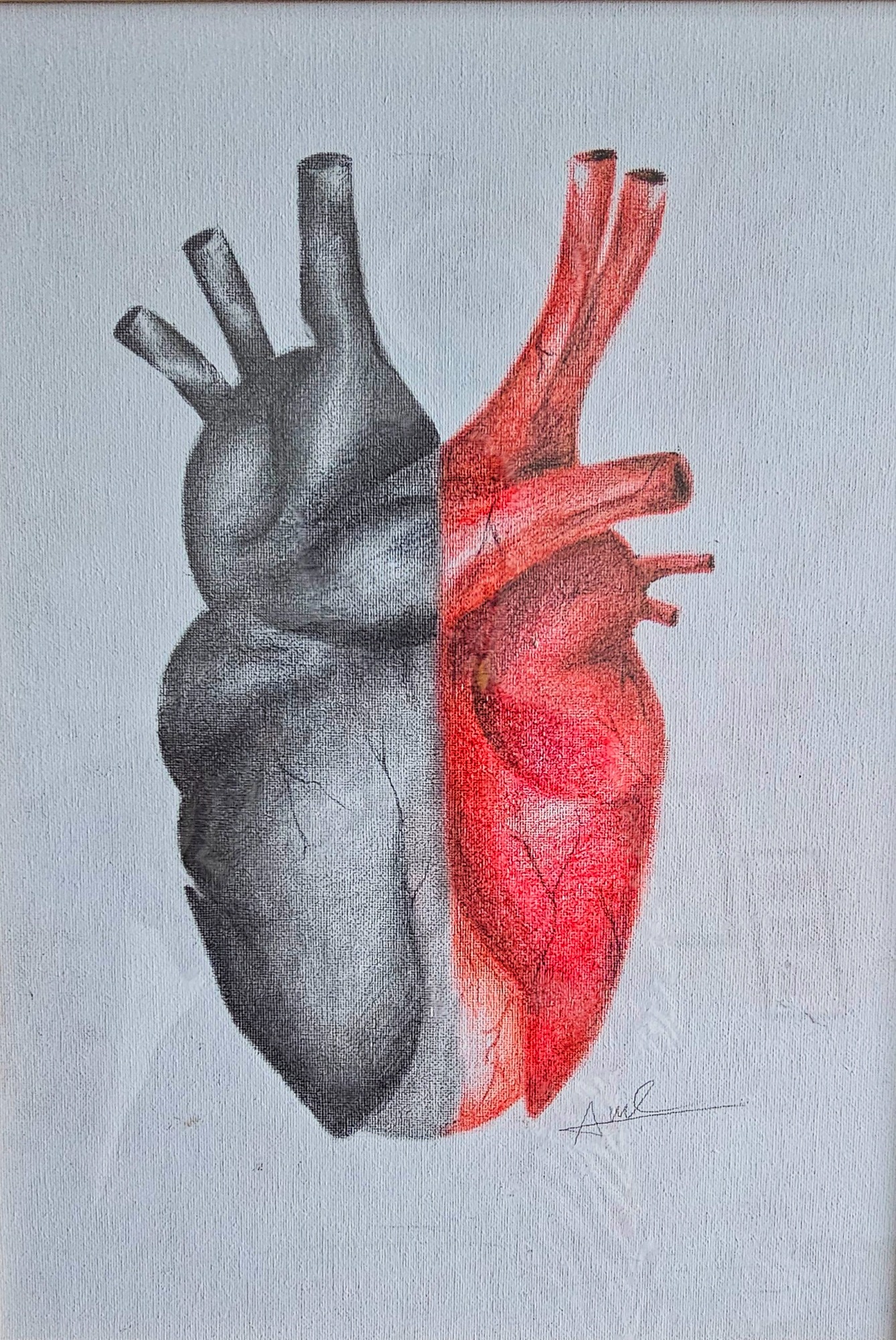 "Half-Hearted" Grey and colour pencil drawing on framed canvas. Commissioned. Sold. Please contact me if you would like something similar.
